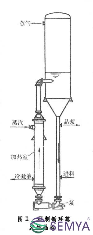 強(qiáng)制循環(huán)蒸發(fā)結(jié)晶器  一種晶漿循環(huán)式連續(xù)結(jié)晶器(圖1)。操作時(shí),料液自循環(huán)管下部加入,與離開(kāi)結(jié)晶室底部的晶漿混合后,由泵送往加熱室。晶漿在加熱室內(nèi)升溫(通常為2~6℃),但不發(fā)生蒸發(fā)。熱晶漿進(jìn)入結(jié)晶室后沸騰,使溶液達(dá)到過(guò)飽和狀態(tài),于是部分溶質(zhì)沉積在懸浮晶粒表面上,使晶體長(zhǎng)大。作為產(chǎn)品的晶漿從循環(huán)管上部排出。強(qiáng)制循環(huán)蒸發(fā)結(jié)晶器生產(chǎn)能力大,但產(chǎn)品的粒度分布較寬。